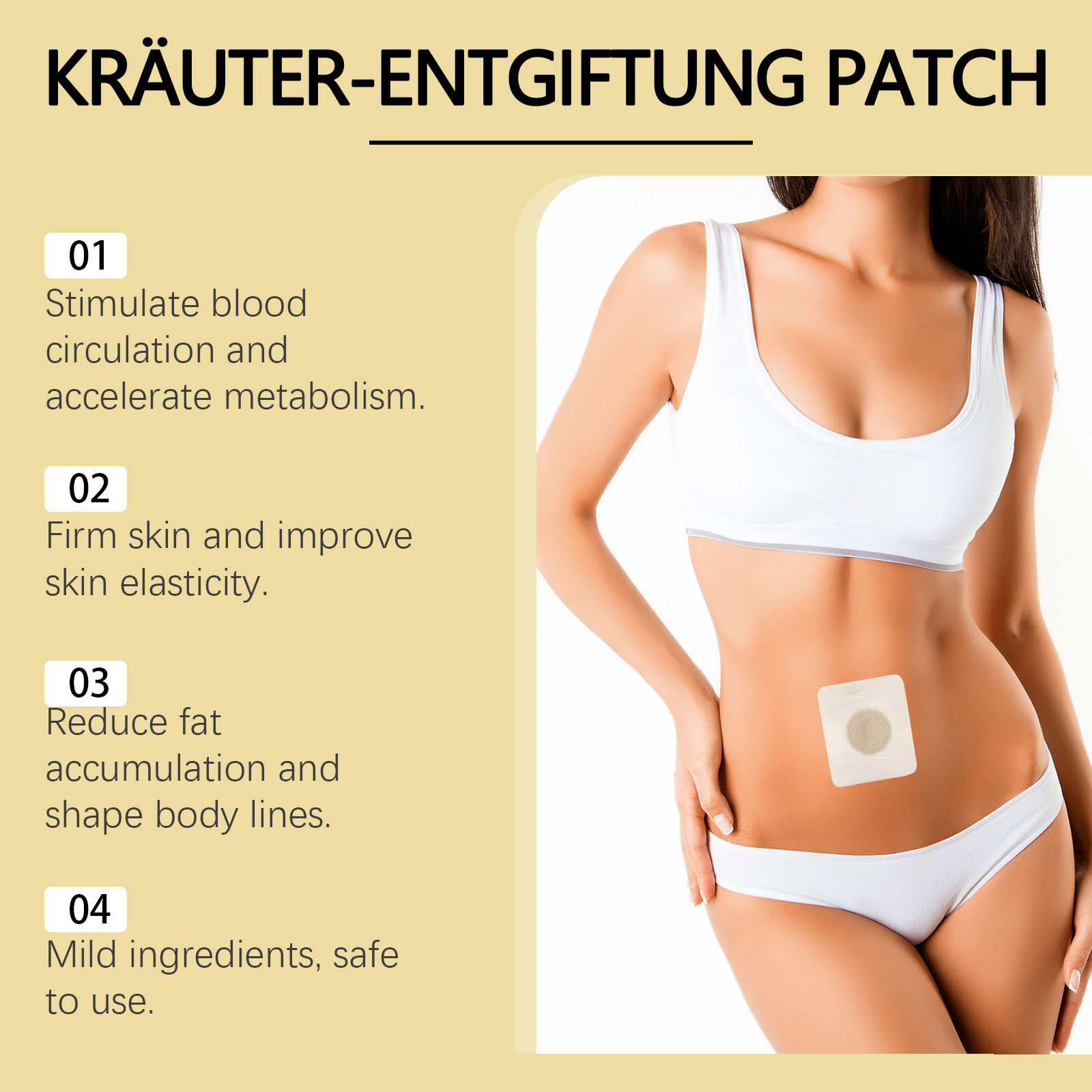 Our herbal detox patches contain glycerin and ginger root extract. It can help break down and reduce excess fat in the body and shape the body. The way to use it is simple: clean the skin around the belly button and keep it dry. Place the capsule on the belly button, then align the patch with the belly button and apply, gently pressing the patch to ensure proper bonding. Wait 3-4 hours and then remove the patch. After use, the skin feels firm and elastic, reduces sagging and improves appearance and texture.